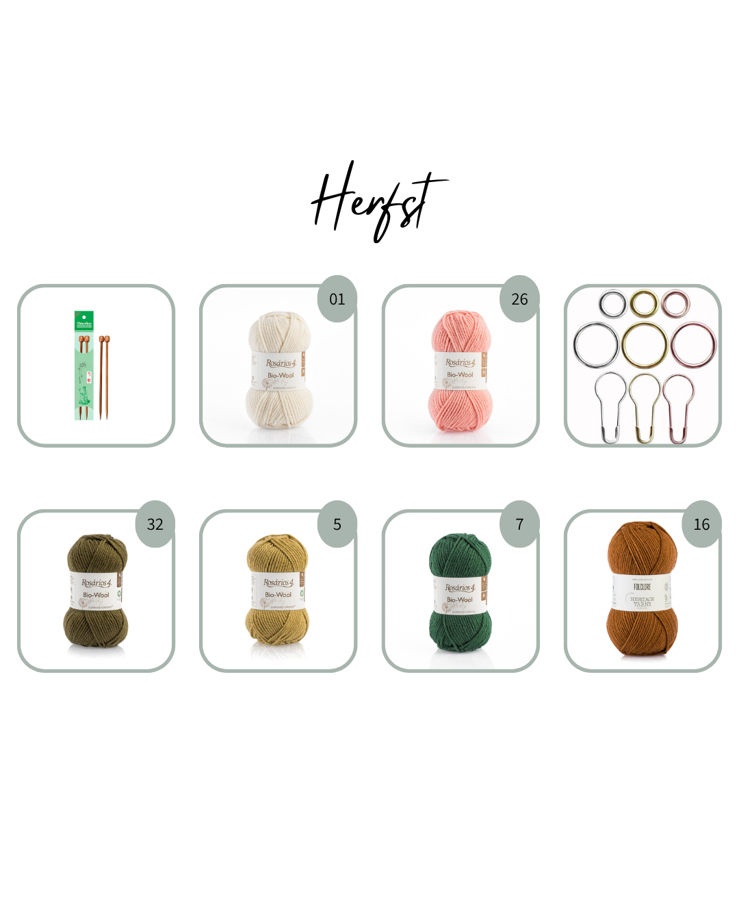 Basis Breipakket voor de beginnerscursus van Mirjam Molenbeek in de combinatie herfstkleuren.